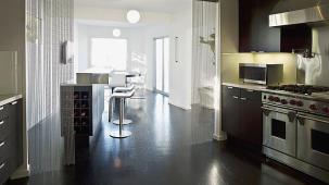 This apartment with nice shades of blue and a beautiful bathroom will help you to relax after work.